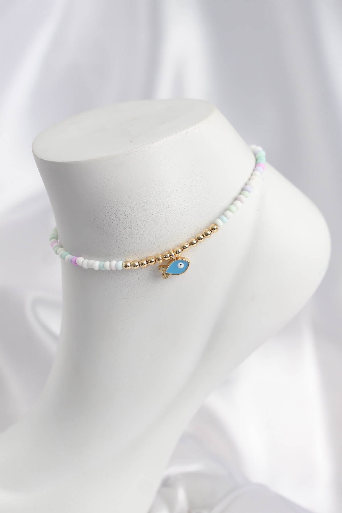 Beyaz ve Karışık Renk Boncuklu Balık Figürlü Halhal