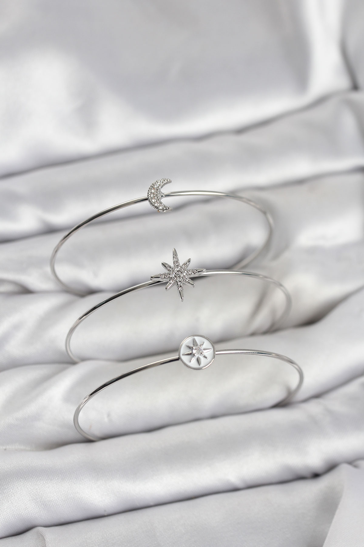 Gümüş Renk Zirkon Taşlı Kutup Yıldızı Model 3'lü Kadın Bileklik Kombini