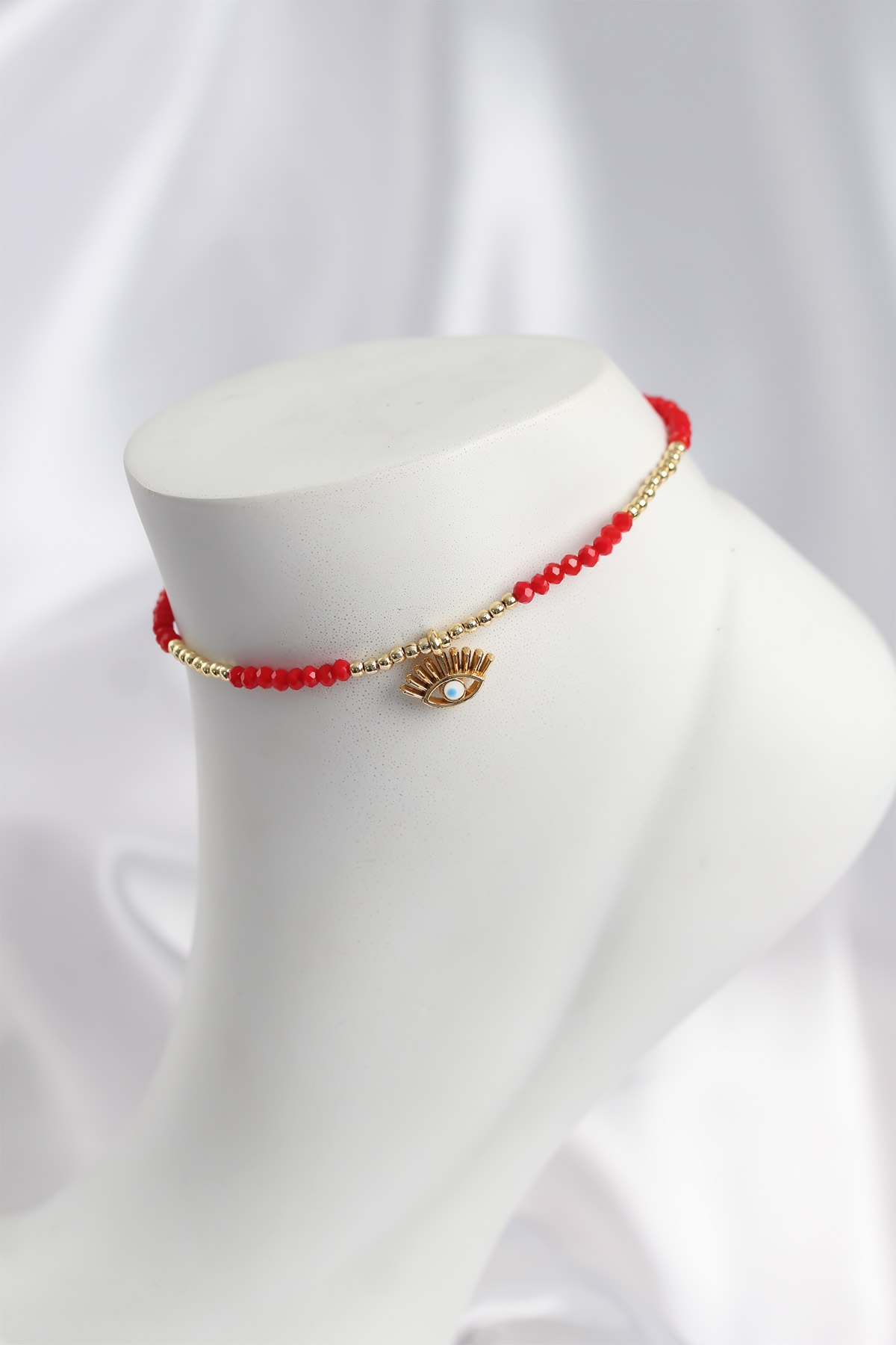 Kırmızı Renk Boncuklu Nazarlı Göz Figürlü Halhal