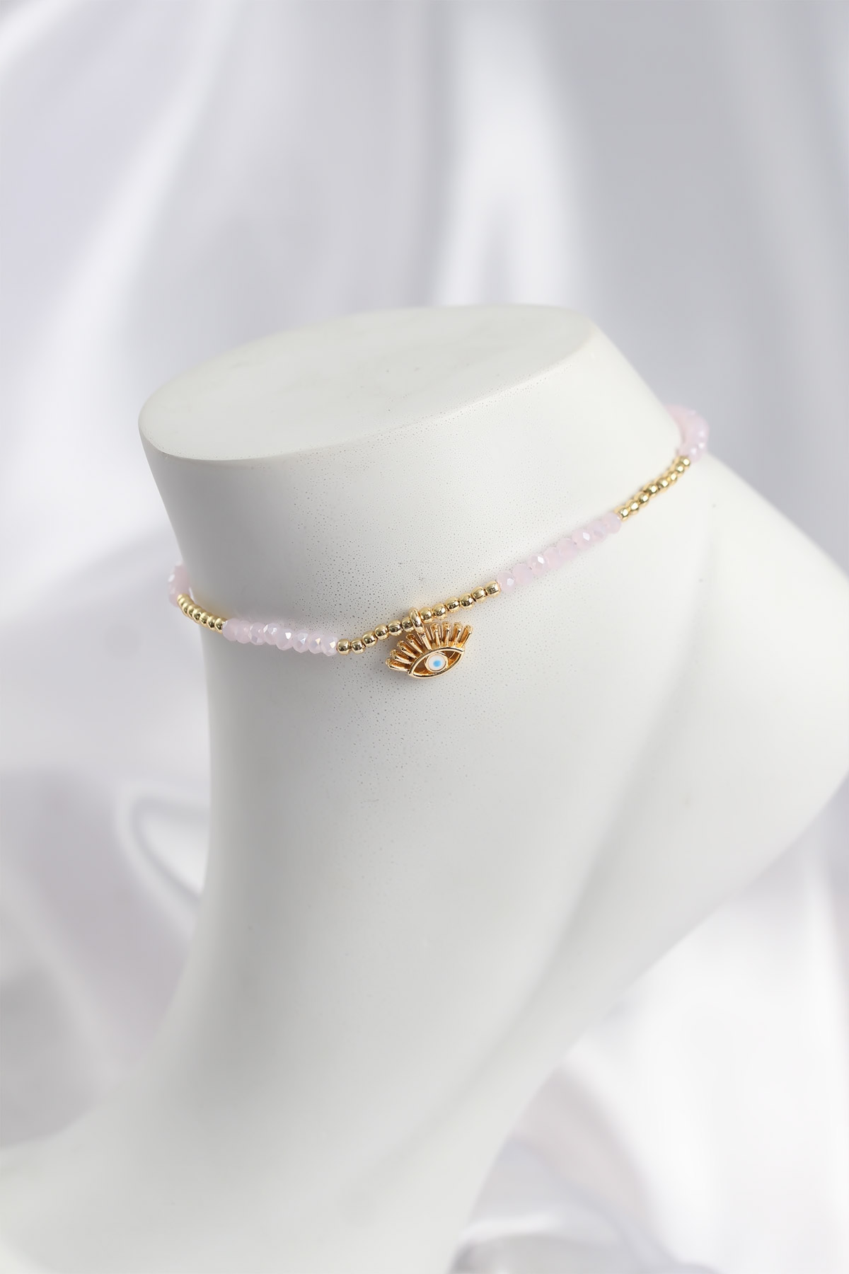 Pembe Renk Boncuklu Nazarlı Göz Figürlü Halhal