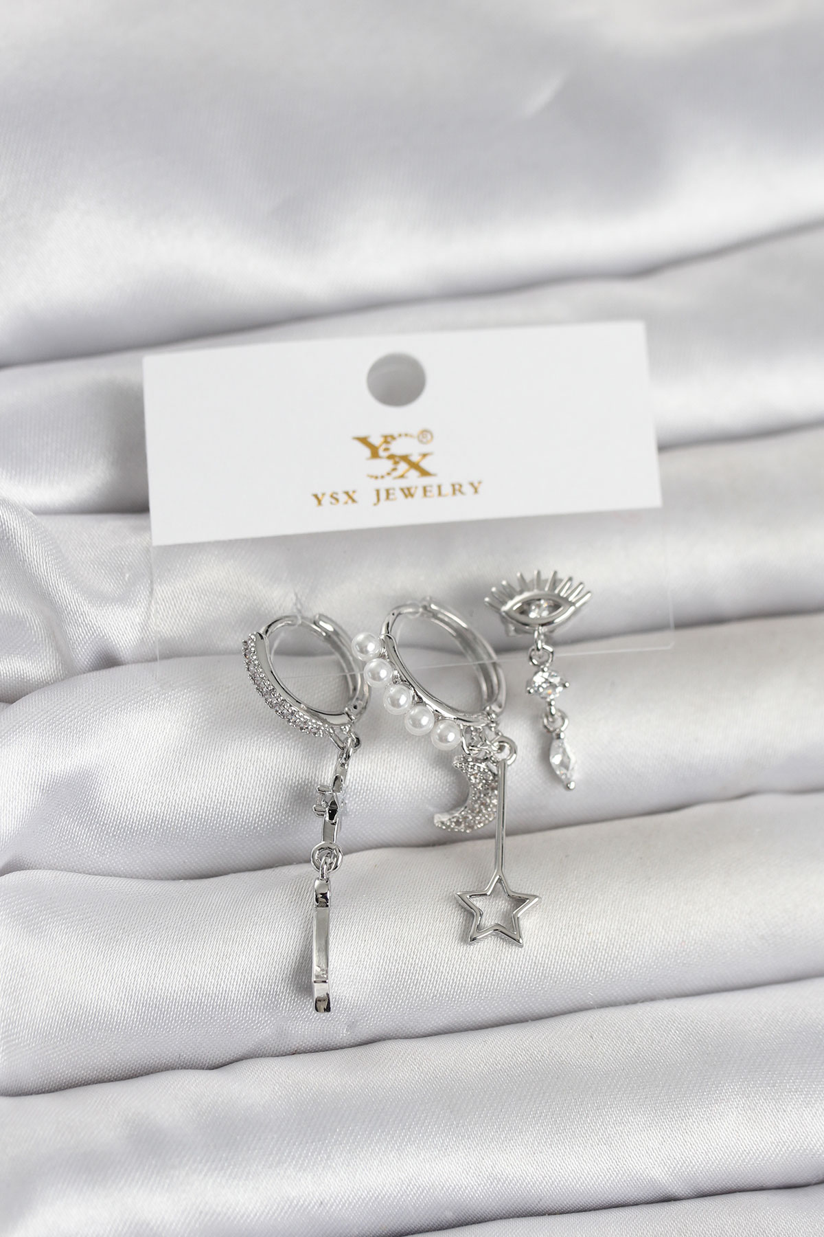 Pirinç Gümüş Renk Zirkon Taşlı Gece Temalı 3'lü Kadın Küpe